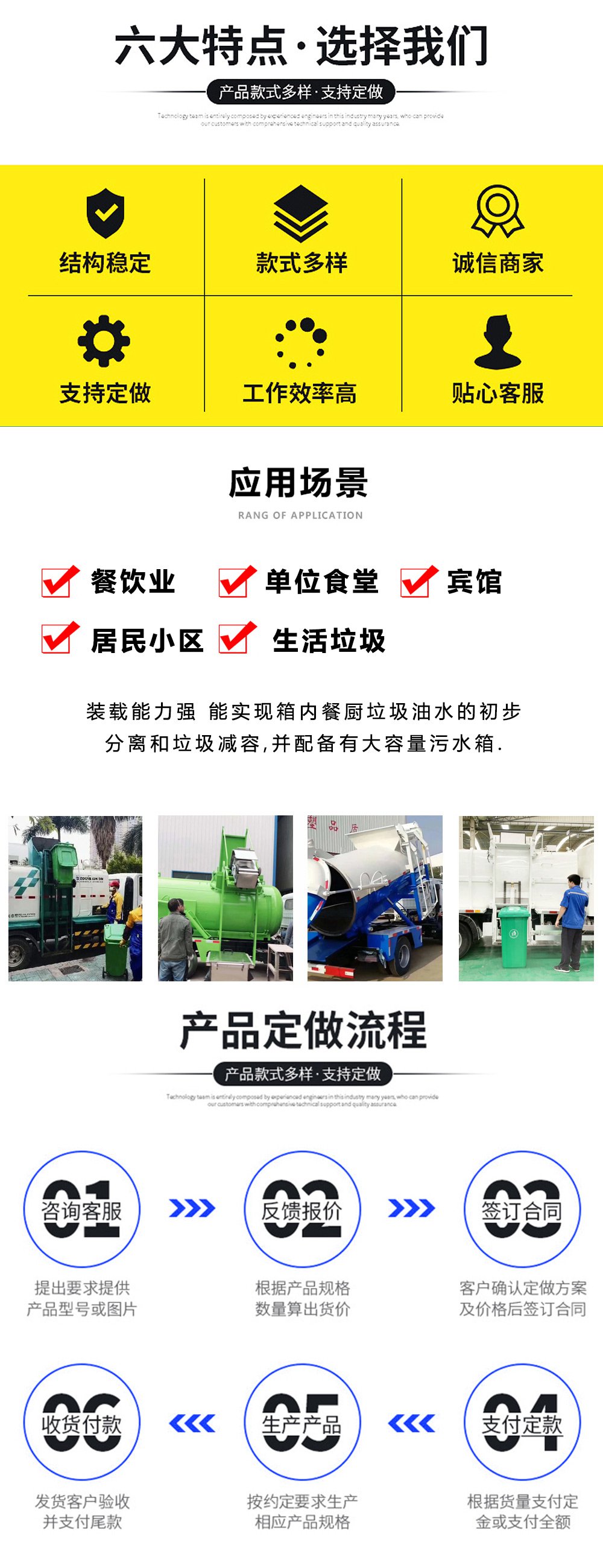 5.装载能力强 能实现箱内餐厨垃圾油水的初步分离和垃圾减容,并配备有大容量污水箱.