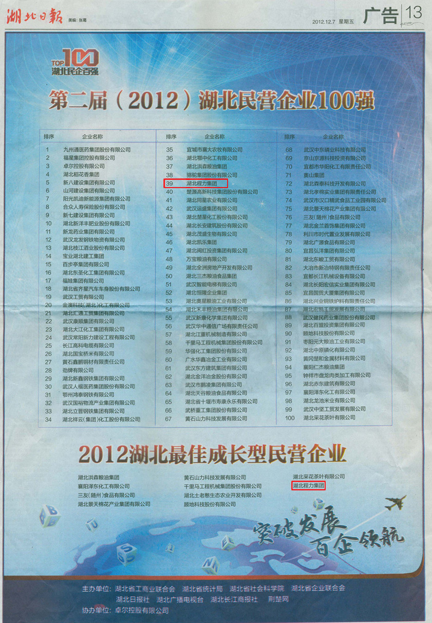 2012年湖北省民营企业100强,湖北程力集团排名39位。湖北程力专用汽车有限公司是程力集团旗下专用车制造公司,程力集团致力于专用车制造,驾驶培训,加油站,教育投资房地产建设等领域。湖北程力洒水车销量行业第一,洒水车价格最优惠!