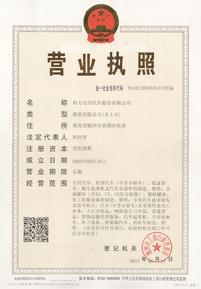 2017年6月14日程力专用汽车股份有限公司注册资金更改为“壹亿圆整”,现做以下通知:2013年注册资金为壹亿伍仟玖佰万元的注册信息失效,以程力专用汽车股份有限公司投标的授权经理需将资质更换为2017年程力最新营业执照,程力社会统一信用代码:91421300764141823Q 维持不变。