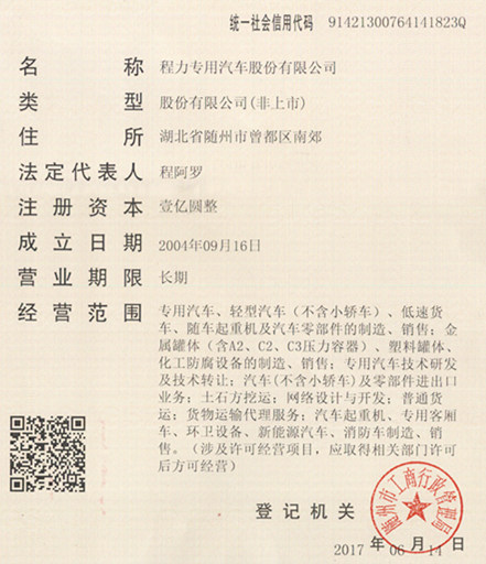 2017年6月14日程力专用汽车股份有限公司注册资金更改为“壹亿圆整”,现做以下通知:2013年注册资金为壹亿伍仟玖佰万元的注册信息失效,以程力专用汽车股份有限公司投标的授权经理需将资质更换为2017年程力最新营业执照,程力社会统一信用代码:91421300764141823Q 维持不变